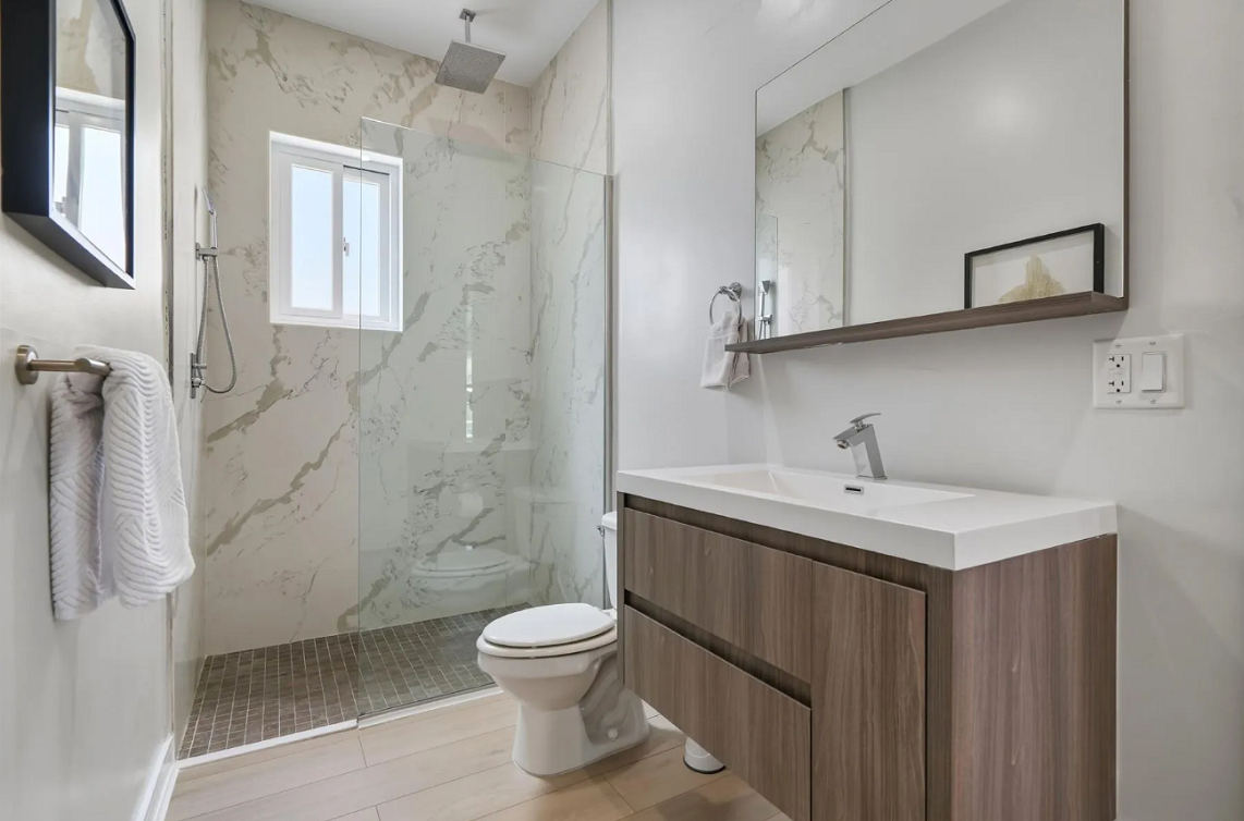 A well-proportioned second bedroom is complemented by a full bathroom, ideal for guests or family. Both bedrooms are designed to emphasize comfort and capture natural light.