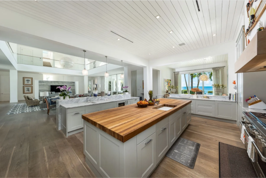 The chef’s kitchen features Wolf and Sub-Zero appliances, an oversized island with bar seating, and a sunlit breakfast nook framed by coastal vistas. A walk-in pantry, laundry suite with double washers and dryers, and a mudroom with powder room ensure seamless functionality.