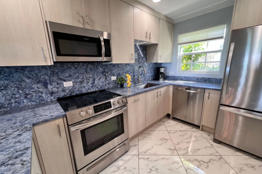 The modern kitchen is outfitted with high-end finishes, including striking blue granite countertops and a matching backsplash. Clean lines and functional layout enhance both form and function, creating a space that is as practical as it is beautiful.