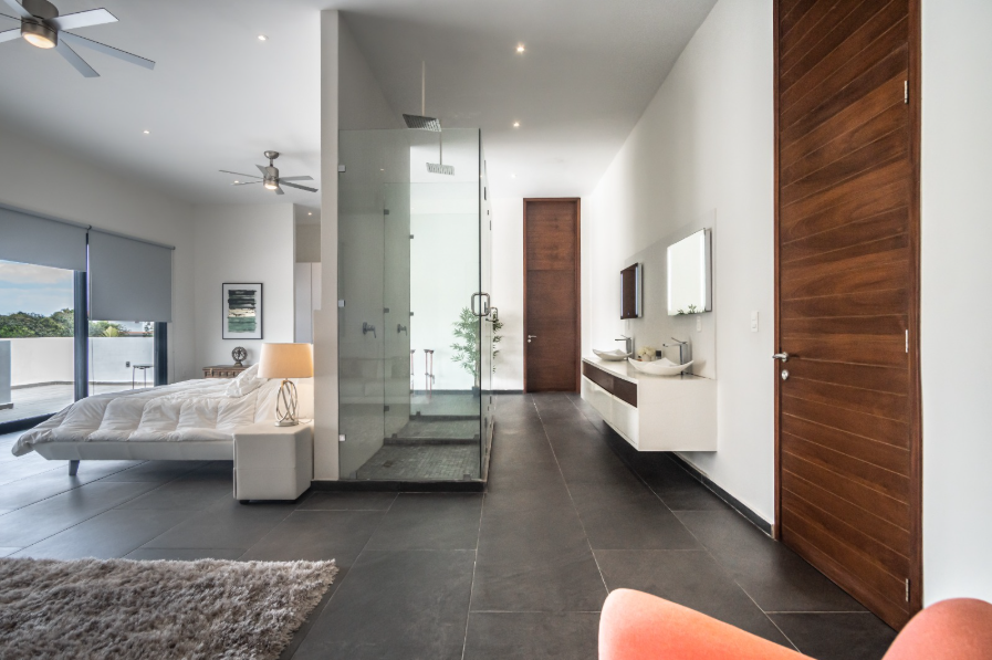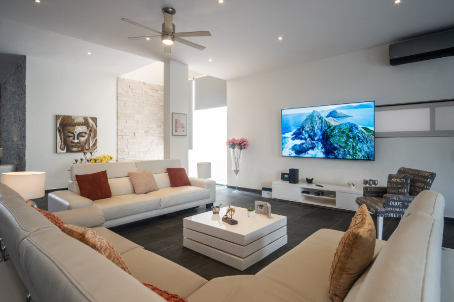 A plush lounge and TV area provide a perfect retreat, exuding comfort and style. This level hosts two of the five generously-sized bedrooms, each adorned with contemporary en-suite bathrooms featuring polished cement finishes and LED-lit mirrors. The meticulous attention to detail is evident in every aspect of these spaces.