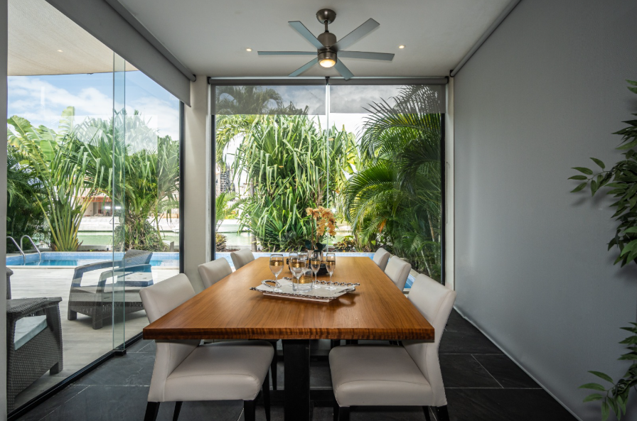 The meticulously landscaped tropical garden not only provides a haven of privacy but also serves as an outdoor oasis. Revel in the covered dining area, find shade in the lounge space, and refresh yourself in the large swimming pool—a perfect setting for entertaining or unwinding in style.