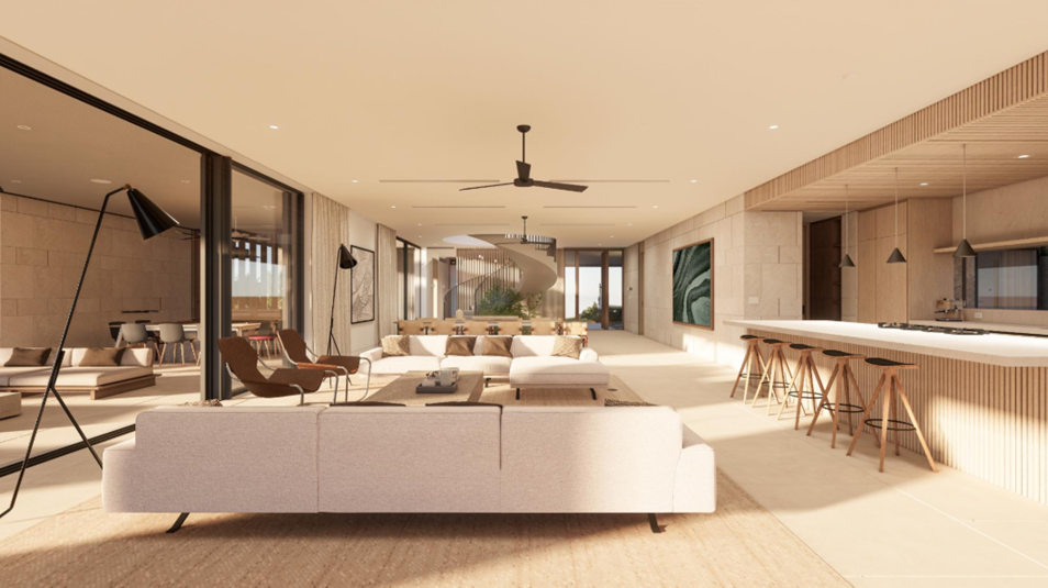 At the heart of the home, a sculptural spiral staircase serves as a design centerpiece, effortlessly connecting open-plan interiors with sun-soaked terraces and a generous 33ft x 15ft pool. A screened outdoor living and dining lounge invites breezy evenings spent entertaining, while the tranquil spa garden terrace, with the option for a private pool, creates the perfect space for quiet reflection.