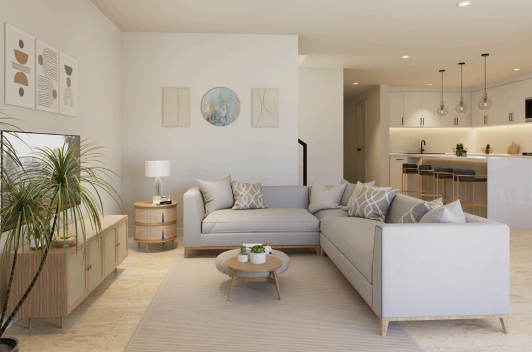The open-plan kitchen and dining area will be equipped with modern appliances and includes a large dining table with room for six and an island unit with three additional bar seats. The living area is framed by a large, comfortable L-shaped sofa and full-length sliding glass doors, create a seamless flow between indoor and outdoor living. The swimming pool, sun deck and patio area will be fully fenced and encased in lush tropical landscaping.