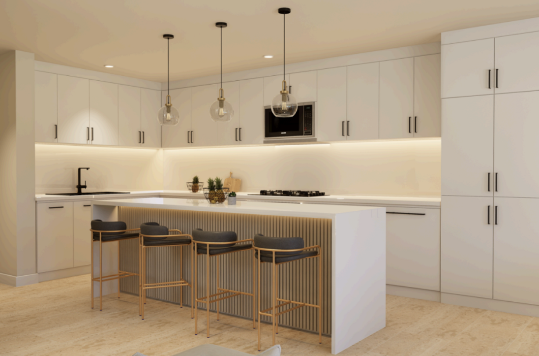 The open-plan kitchen and dining area will be equipped with modern appliances and includes a large dining table with room for six and an island unit with three additional bar seats. The living area is framed by a large, comfortable L-shaped sofa and full-length sliding glass doors, create a seamless flow between indoor and outdoor living. The swimming pool, sun deck and patio area will be fully fenced and encased in lush tropical landscaping.