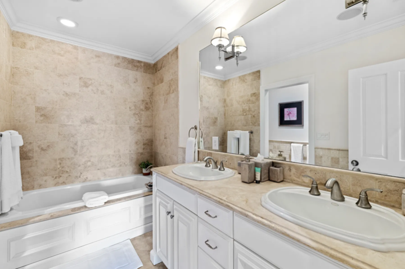 Enjoy the elegance of crown moldings, recessed lighting, sound system and travertine floors throughout. The state-of-the-art kitchen is designed with custom hardwood cabinetry, granite countertops and top-of-the-line Bosch and Viking appliances, perfect for both gourmet cooking and entertaining.